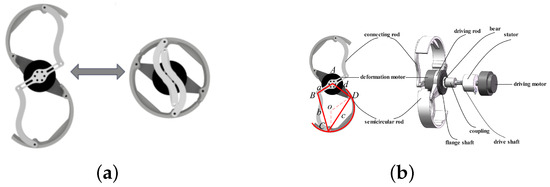 The transformable wheel consists of a transformation motor and two symmetric four-bar linkages, which functionally operate as a six-bar mechanism. The rotor of the transformation motor is rigidly coupled to a crank, which, through an ‘S’-shaped connecting rod, is linked to the semicircular leg. The rear of the Transformation motor is affixed to a drive rod and a flange disk using screw holes. These components are then connected to the robot’s internal motion motor via a drive shaft. The drive shaft is fitted with a coupler and a conductive slip ring, the function of which has been described previously.