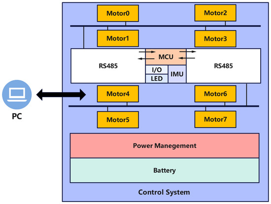 The control platform consists of the power supply, control system, communication bus, and sensors, as shown in the system block diagram in Figure 5. The power supply is divided into two separate units. The first unit powers the motors, utilizing a 6S RC lithium battery that distributes power to the eight servo motors via a custom-designed power distribution board. The second unit powers the control board, using an 18,650 lithium battery to supply power to the main control board and associated external sensors.