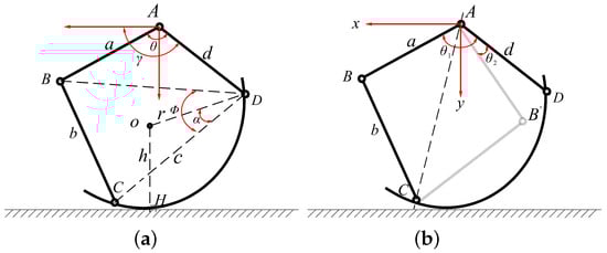 Kinematics analysis diagrams of the linkage mechanism. (a,b) illustrate the definition of kinematic parameters.