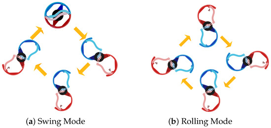 The distinct locomotion modes of our robotic system. (a) the swing mode, showing the motion process of the leg mechanism, and (b) the rolling mode, depicting the motion process of the leg mechanism.