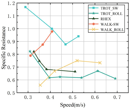 Swing-Leg Trot Gait—The swing-leg trot gait shows higher specific resistance at low speeds due to the inherent instability of trotting at these speeds. As speed increases, energy consumption decreases, indicating that the trot gait is more efficient for higher-speed movement. Similar to the swing-leg walk gait, the maximum speed in this gait is constrained by the high load experienced during rapid leg swing.
