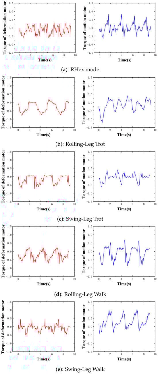 We plotted the torque curves of the motion and Transformation motors under different motion strategies at comparable speeds (approximately 0.4 m/s), as illustrated in Figure 10. This analysis focuses on comparing the traditional swing-leg mode with the rolling-leg strategy.