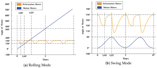 Figure 11 presents a comparative analysis of the angular displacement profiles for both the motion motor and deformation motor across different locomotion strategies, derived through inverse kinematic computations based on the robot’s prescribed trajectory. The key observation reveals fundamentally distinct actuation patterns: under the rolling strategy, the primary motion motor exhibits a quasi-linear angular progression, demonstrating near-constant velocity characteristics that ensure smooth kinetic energy transfer. In contrast, the swing strategy induces pronounced periodic fluctuations in the motion motor’s angular displacement, corresponding to the repetitive acceleration-deceleration cycles inherent to pendulum-like leg motion. These quantitative differences mechanistically explain the rolling strategy’s superior velocity continuity and energy efficiency. The deformation motor’s angular profiles further corroborate this distinction, showing minimal variation during rolling versus active modulation in swing mode to facilitate leg repositioning.