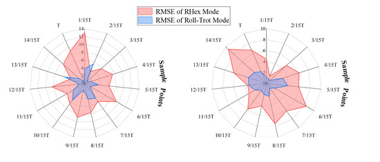 To better illustrate the differences between the rolling-leg mode and the RHex mode, we also examined their stability in terms of body balance. We used the root mean square error (RMSE) to assess stability, defined as