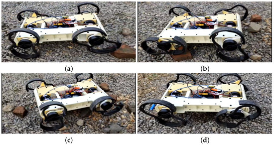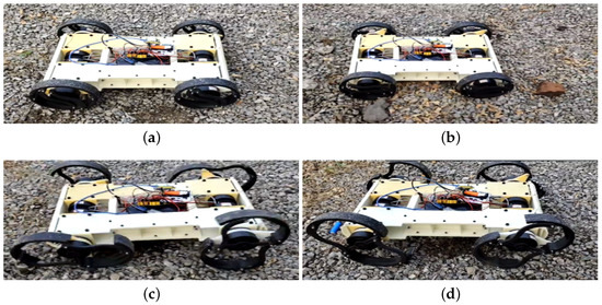For a leg–wheel hybrid robot, performing basic gaits and obstacle traversal is a common task. However, achieving jumping capability in addition to these functionalities is not an easy feat. Nevertheless, R-Taichi has successfully accomplished this, as shown in Figure 16. The foundation of R-Taichi’s ability to jump lies in its deformable leg structure. Prior to jumping, the robot first prepares by moving in wheel mode. Just before the jump, the robot slightly extends its legs, as seen in Figure 16a. Following this, the robot’s legs suddenly extend from a small angle to a larger angle, much like a spring storing maximum elastic potential energy when compressed to its smallest size. We also aim for the robot to find the optimal angle and position for leg extension before the jump. Therefore, Figure 16b illustrates the adjustment process of the robot’s legs, a step that allows the robot to store as much potential energy as possible, which is provided by the motors. The next step involves the robot activating the leg motors. If only the deformable motor is activated, the robot will theoretically perform a vertical jump. However, if the drive motors are also activated, the robot can jump in other directions. As shown in Figure 16c, the robot performs a vertical jump. Finally, the robot lands, as shown in Figure 16d. This completes the jumping process. Currently, the highest jump achieved by the robot is 360 mm from the ground to the robot’s base.