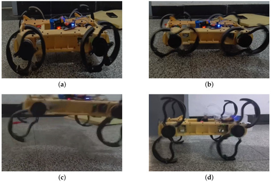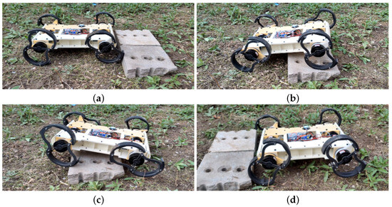 The sequence of images illustrates the robot’s process of overcoming an obstacle. Figures (a,b,c,d), respectively, depict the robot encountering the obstacle, approaching the obstacle, starting the crossing maneuver, and successfully crossing the obstacle.