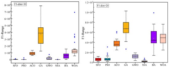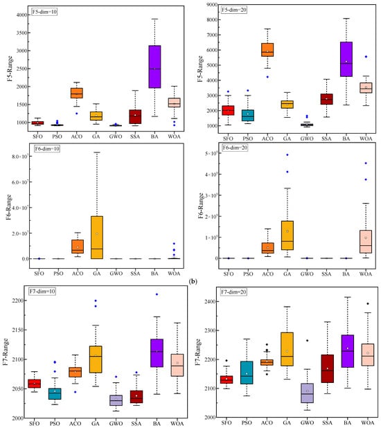 Table 7), the statistical indicators in this figure show that only SFO consistently converges to zero with minimal variance, while other algorithms exhibit higher average errors and wider dispersions.