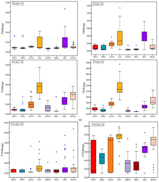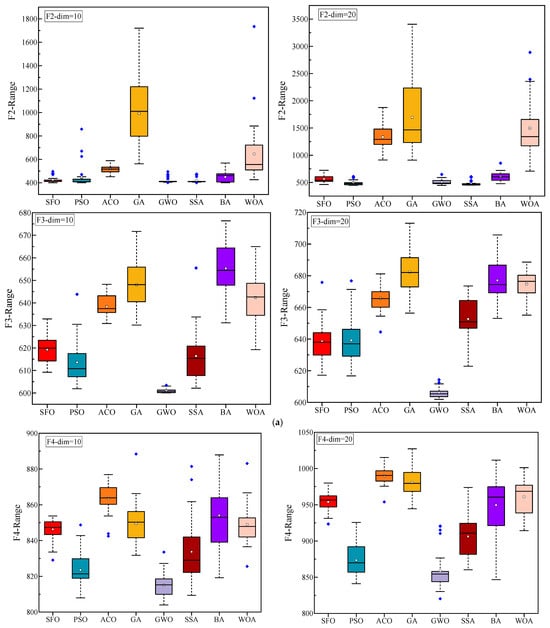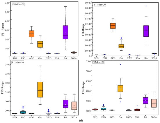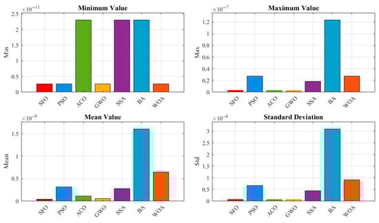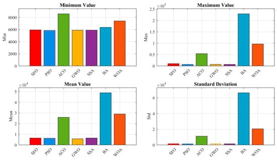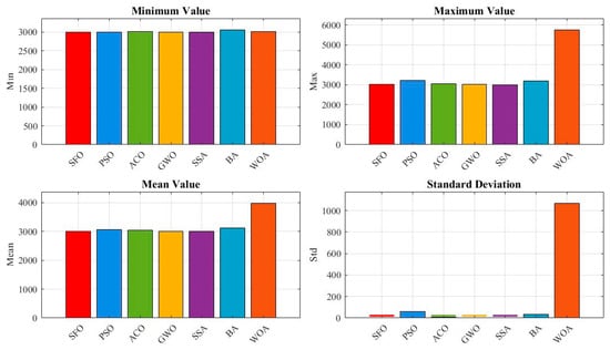 Figure 11 provides a bar chart comparison of four statistical indicators: minimum, maximum, mean, and standard deviation. SFO ranks second in minimum and mean values, slightly behind SSA, which achieves the best scores across all metrics. The standard deviation of SFO is notably lower than that of most compared algorithms, demonstrating robust convergence.