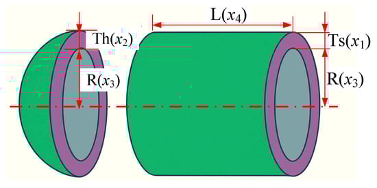 The pressure vessel design problem is a widely cited benchmark in structural engineering optimization. The design consists of a cylindrical vessel capped with two hemispherical heads. The primary objective is to minimize the total fabrication cost, which comprises the material cost, forming cost, and welding cost. To achieve this, the design must determine four key variables: the thickness of the shell and head (denoted as Ts = x