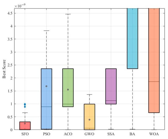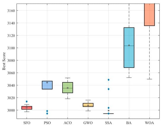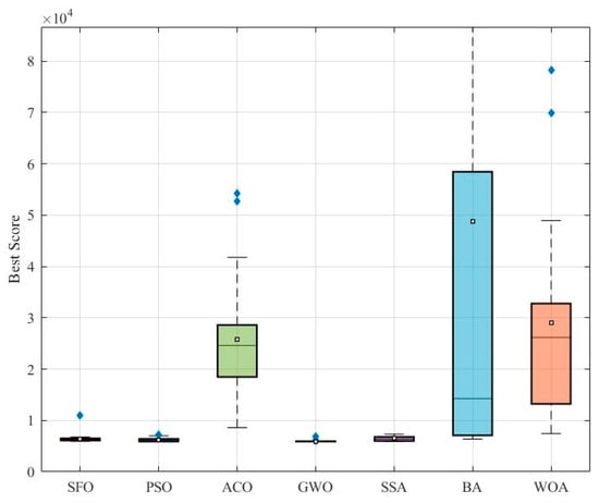 Figure 13, the boxplot reveals the distribution of the best objective values over 50 independent runs. The SFO algorithm clearly outperforms all other algorithms, achieving the lowest median value and the narrowest spread. In contrast, algorithms such as BA and WOA exhibit much higher variability and worse overall solution quality, with significant outliers. This indicates that SFO not only finds better solutions but also maintains high stability and robustness.