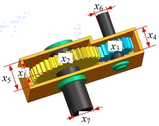 Figure 9, the speed reducer consists of two independent shafts equipped with gears, which are sequentially connected to the main shaft via bearings. The optimization problem involves seven design variables and eleven inequality constraints. The decision variables include the following: face width (x