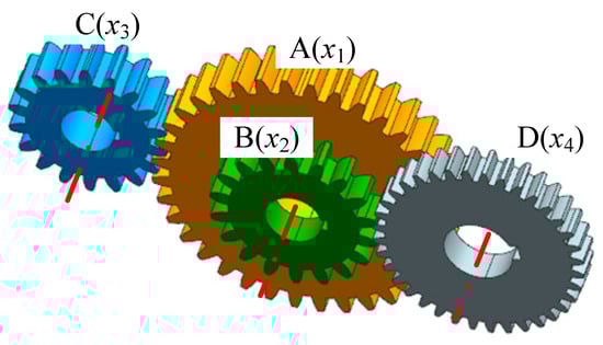 The gear train design problem is a typical unconstrained discrete integer optimization problem in mechanical engineering. The objective is to minimize the gear ratio error between the input and output shafts. The gear ratio is defined as the ratio of the angular velocity of the output shaft to that of the input shaft. Let the number of teeth on gears A, B, C, and D be denoted as