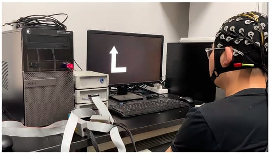 This study employed two computers to construct a motor imagery experimental platform and adopted a non-invasive method to collect EEG signals from participants during motor imagery tasks. EEG signals were recorded using the BrainProducts EEG acquisition system from Germany, which included a 64-channel electrode cap, a BrainAmp amplifier, and a signal processor. The hardware bandpass filter was configured to the default range of 0.1–250 Hz, and the EEG signals were sampled at 250 Hz, yielding 750 data points for each 3 s motor imagery trial. The software tools used in the system included E-Prime, BrainVision Recorder, and BrainVision Analyzer, which were utilized for designing the experimental paradigm and for EEG signal acquisition and analysis. Using E-Prime, the experimental paradigm was designed to instruct participants via Computer 1 to perform the corresponding motor imagery tasks, as illustrated in Figure 1.