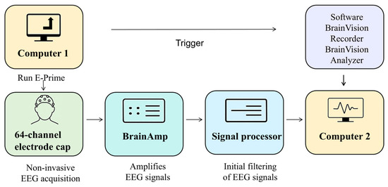 Figure 2 illustrates the procedure for experimental EEG data acquisition. The BrainAmp amplifier amplified the EEG signals collected from the electrode cap at a fixed gain. The signal processor performed the preliminary filtering of the EEG signals. The raw data from all the EEG channels were recorded in real time using BrainVision Recorder and stored on Computer 2. The signals are also displayed on the screen to allow the experimenter to monitor them for abnormalities. A 64-channel electrode cap conforming to the international 10–20 system was used to measure the weak voltage amplitudes at 64 scalp locations.