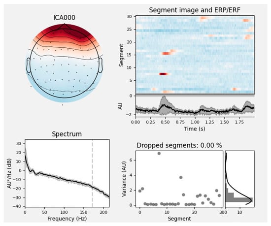 Analysis of ocular artifacts. The top left plot shows the spatial distribution of the ICA component on the scalp; the top right plot presents the time series and ERP/ERF of the component, highlighting the temporal characteristics and the presence of artifacts. The spectrum plot in the lower left shows the power spectral density changing with frequency, indicated by a black line. The lower right plot shows variance in grey dots and the percentage of dropped segments due to artifacts in a black line, with zero percent in this instance.