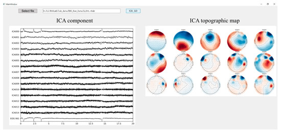 To enhance the automation and efficiency of artifact removal, an interactive tool for automatic artifact removal was developed using PyQt5, leveraging the ICA probability analysis functionality provided by MNE. The user interface is shown in Figure 7. Users simply select the EEG file to be processed via the input field at the top of the interface. In the example shown, EEG data from subject LLS01 in the rehabilitation motor imagery dataset is selected. The tool integrates an embedded ICA component classification algorithm based on MNE, with the number of components preset to 15. It outputs both the time-domain waveforms and scalp topographies of each component. Components predicted to be non-neural signals with a probability greater than 90% are automatically removed. The cleaned EEG signals are saved in .vhdr format and exported automatically.