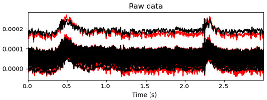 A comparison of the EEG time-domain signals before and after artifact removal is shown in Figure 8 and Figure 9. In Figure 8, the red curves represent the EEG signals before artifact removal, while the black curves represent the signals after processing. As can be observed in the figure, at several time points—such as at around 0.5 s and 2.25 s—the red curves exhibited pronounced high-amplitude fluctuations, indicating significant artifact contamination in the raw signals. After automated ICA processing, the amplitude of the fluctuations in the black curves was significantly reduced, resulting in a more stable signal with the evident suppression of physiological artifacts such as eye movements, muscle activity, and cardiac interference. As the figure displays overlaid waveforms from all the channels, the convergence of the black curves suggests that artifact removal not only improved the signal quality at the individual-channel level but also enhanced the overall consistency of the EEG data. This provided a reliable signal foundation for subsequent feature extraction and classification tasks.