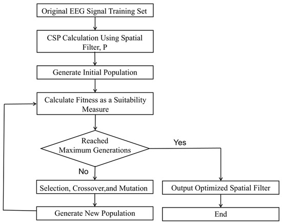 Therefore, in this study, a genetic algorithm was employed to identify the information distribution across the CSP feature matrix, enabling the retention of the most informative features while reducing the overall dimensionality. Due to its global search capabilities and ability to avoid local optima, the genetic algorithm is particularly well suited for feature selection tasks. In the context of EEG spatial filtering, it facilitates the efficient exploration of the search space of spatial filter combinations to select the most discriminative components.