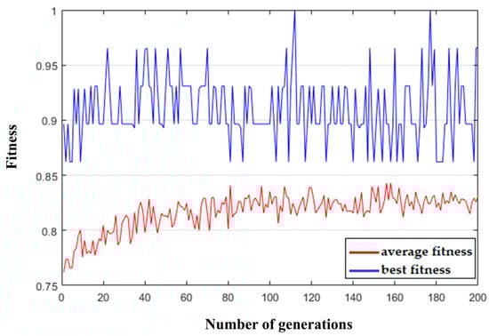 The training data used in this step was the raw EEG signal A01T from subject A01 in the BCI-IV-2a dataset. After preprocessing, the left-hand and right-hand trials were selected to construct the training set for validating the proposed algorithm. During the genetic algorithm-based weight selection process, the average and best fitness values of each generation were recorded. The statistical results are shown in Figure 12. The best gene (the optimal weight sequence W) in each generation was also tracked.