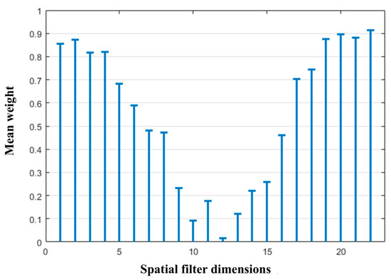 As shown in the figure, the average fitness value initially increased slightly as the number of generations increased and then tended to stabilize. The optimal genes from generations 100 to 200 were selected, and their binary elements were averaged, as shown in Figure 13. The weight gene sequence W corresponding to the spatial filter matrix P shows that the high-weighted features were mostly concentrated at the beginning and end of the spatial filter matrix. In contrast, the middle rows exhibited generally low weights, indicating that the corresponding features carried limited information. Therefore, to reduce the dimensionality without a significant loss of informative content, the top n and bottom n rows of the spatial filter matrix P were selected. In this step, n = 4 was selected, reducing the original 22-row spatial filter matrix P to 8 rows, which reduced the feature extraction complexity while retaining the most informative spatial dimensions.