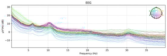 In this study, the time-domain-preprocessed dataset was further processed in the frequency domain using the Welch PSD estimation method, and its frequency-domain features were extracted to serve as an alternative input to the proposed network model. Figure 14 shows the power spectral density maps of the raw EEG signals from subject LLS01 in the motor imagery rehabilitation dataset, extracted using the Welch PSD estimation method for each EEG channel.