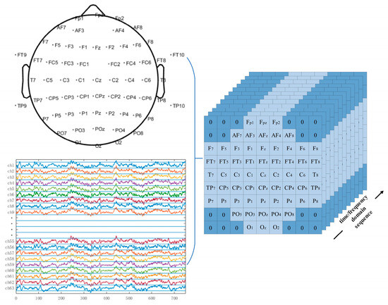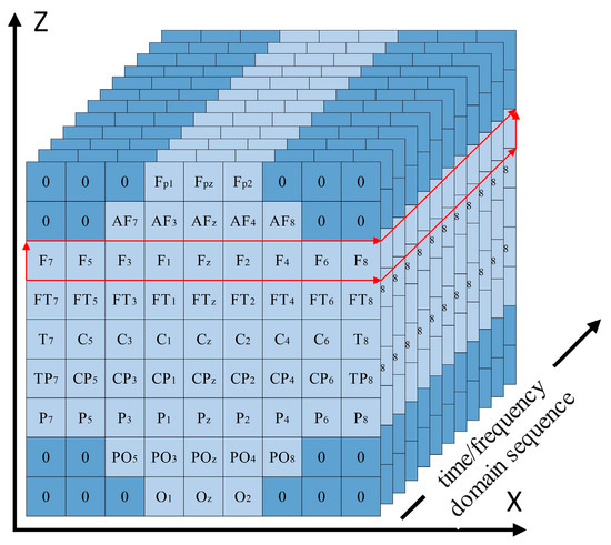 The model took 3D EEG data as its input, with an input layer of the shape (W,W,T). The use of the time-domain 3DEEG input is considered an end-to-end classification approach. The use of the frequency-domain 3DEEG input can be regarded as a non-end-to-end classification approach. In this approach, both the training and testing sets consisted of PSD feature vectors extracted using the Welch method. These vectors were then transformed from 2D EEG representations into a 3DEEG input format according to the three-dimensional signal reconstruction scheme illustrated in Figure 15.