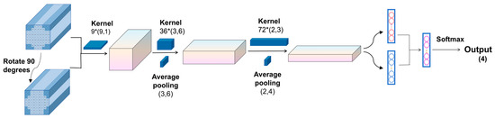 The first convolutional layer was a depthwise convolution layer with a kernel size of (9,1) and output channel depth of W, using zero padding and a stride of 1. The activation function was ELU, and a dropout rate of 0.25 was applied. The second convolutional layer was also depthwise, with a kernel size of (3,6) and 36 output channels. It used zero padding, a stride of 1, and ELU as the activation function. A batch normalization layer was applied, along with a dropout rate of 0.25. Finally, an average pooling layer with a kernel size of (3,6) was used to reduce the feature dimensions. The third convolutional layer was again depthwise, with a kernel size of (2,3) and 72 output channels. It used zero padding, a stride of 1, and ELU as the activation function. A batch normalization layer was also included to accelerate convergence. An average pooling layer with a kernel size of (2,4) was subsequently used. A fully connected layer with 256 units was added, followed by a Softmax layer for four-class classification.