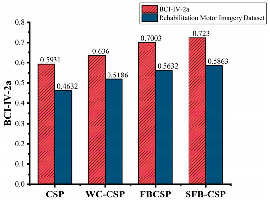 Figure 19 presents the average classification accuracy of the four feature extraction methods, providing an overall comparison of their performance across both datasets. The SFB-CSP method outperformed the other methods on both datasets, achieving accuracies of 72.30% on the BCI-IV-2a dataset and 58.63% on the rehabilitation motor imagery dataset. Compared to the FBCSP algorithm, the SFB-CSP improved the average four-class classification accuracy by 2.27% and 2.31% on the two datasets, respectively. This improvement can be attributed to the SFB-CSP’s ability to combine the spatial and spectral features, thereby enhancing its adaptability to multi-class tasks while offering better noise resistance and feature optimization. Additionally, the figure reveals that the classification accuracy on the rehabilitation motor imagery dataset was generally lower than that on the BCI-IV-2a dataset. This discrepancy arose from the higher similarity among motor imagery tasks in the rehabilitation dataset, whereas the tasks in the BCI-IV-2a dataset were more distinct, making class-specific features easier to discriminate.