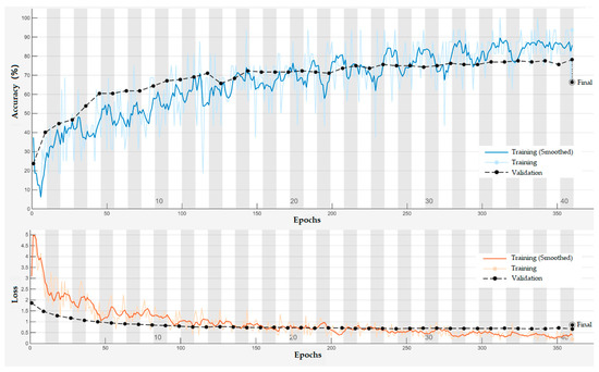 Figure 20 presents the training and validation accuracy and loss curves of the PSD-3DEEG-CNN model over 360 epochs. The training loss decreased rapidly during the first 80 epochs and stabilized thereafter, while the training accuracy steadily improved despite moderate fluctuations. The validation accuracy, evaluated every nine epochs, exhibited a relatively flat trend after epoch 150, suggesting convergence. The final test accuracy of 66.32% suggests that the proposed network is capable of learning discriminative EEG representations for multi-class motor imagery classification, despite the inherent challenges of low signal-to-noise ratios and inter-class similarity in lower-limb EEG data.