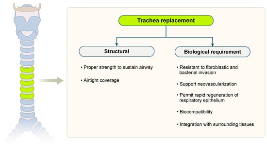 Therefore, tissue-engineered grafts must meet the dual requirements of sufficient rigidity to prevent luminal collapse and sufficient flexibility to accommodate movement and growth. Failure to achieve this balance contributes to the collapse or dysfunction of early synthetic tracheal substitutes [21]. These mechanical requirements inform the essential design principles that must be addressed in engineering tracheal replacements (Figure 1) [22,23].