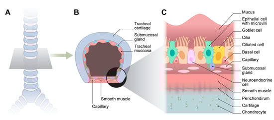 The respiratory epithelium lining the trachea is a specialized pseudostratified ciliated columnar tissue comprising ciliated, mucus-producing, goblet cells; basal progenitors; neuroendocrine cells; and epithelial cells with microvilli [24]. Along with the underlying submucosal glands, these epithelial components form a critical barrier that traps inhaled particulates and facilitates their clearance through the coordinated action of motile cilia (Figure 2).