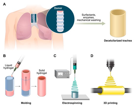 Decellularized tracheal matrices are generated by removing all cellular components from the cadaveric or animal trachea using chemical agents, such as sodium dodecyl sulfate or Triton X-100; enzymatic digestion, such as DNase treatment; and/or physical techniques, such as freeze–thaw cycles [30] (Figure 3).