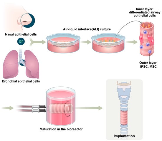 Researchers have sought to reconstruct tracheal structures by implanting autologous cells onto biocompatible scaffolds and incorporating bioactive molecules to promote tissue maturation. Recently, scaffold technologies have advanced significantly, progressing from the use of decellularized donor tissues to patient-specific 3D-printed polymeric scaffolds [7,8]. Simultaneously, notable developments have been made in cell sources, such as induced pluripotent and mesenchymal stem cells, along with improvements in culture methods, including air–liquid interface (ALI) systems and bioreactor-based conditioning [9,10]. Although early studies demonstrated promising outcomes, several persistent challenges have hindered the clinical adoption of tissue-engineered tracheal grafts (TETGs). Mechanical weakness, insufficient vascularization and epithelialization, and immune rejection have played a role in the failure of previous clinical attempts [11].