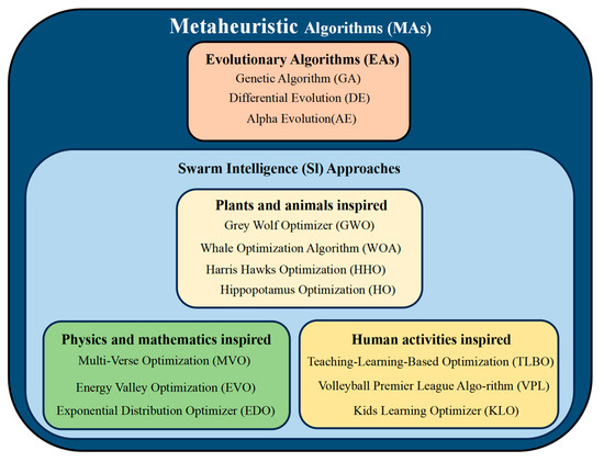 In recent years, metaheuristic algorithms [12,13,14], with their powerful global optimization capabilities, have been widely applied to solve complex optimization problems. These algorithms, by simulating natural phenomena, biological behaviors, or physical processes, effectively explore the solution space and seek global optima. This is especially relevant to the grounding grid corrosion diagnosis problem investigated in this study, which leads to complex, underdetermined, and highly nonlinear systems of equations. Such characteristics make it difficult for traditional analytical or gradient-based approaches to yield stable solutions. Metaheuristic algorithms, due to their global search capabilities and robustness to problem ill-conditioning, are well suited to tackle this class of inverse diagnostic problems. Based on their sources of inspiration, metaheuristic algorithms can be categorized into four major types: (1) Evolutionary Algorithms: These algorithms, inspired by natural selection and species evolution, achieve a balance between global search and local development through mechanisms such as genetic processes, mutation, and selection. Representative algorithms include the Genetic Algorithm (GA) [15], Differential Evolution (DE) [16], the Alpha Evolutionary Algorithm (AE) [17], and Particle Swarm Optimization (PSO) [18]. (2) Algorithms Inspired by Animal and Plant Populations: These algorithms simulate the cooperative and competitive behaviors of animal and plant populations, demonstrating excellent global optimization capabilities. Typical algorithms in this category include Grey Wolf Optimization (GWO) [19], the Whale Optimization Algorithm (WOA) [20], Harris Hawks Optimization (HHO) [21], Hippopotamus Optimization (HO) [22], and the Crawfish Optimization Algorithm (COA) [23]. (3) Algorithms Based on Physical or Mathematical Principles: These algorithms perform optimization by simulating physical phenomena or mathematical laws. Representative algorithms include Multi-Verse Optimization (MVO) [24], Energy Valley Optimization (EVO) [25], Weighted Mean of Vectors Optimization (INFO) [26], and Exponential Distribution Optimization (EDO) [27]. (4) Algorithms Inspired by Human Activities: These algorithms simulate human behaviors or societal activities and draw upon human experiences to perform search and optimization. Notable algorithms include Teaching–Learning-Based Optimization (TLBO) [28], the Volleyball Premier League Algorithm (VPL) [29], the Alibaba and the Forty Thieves Algorithm (AFT) [30], and the Children Learning Optimization Algorithm (KLO) [31]. Figure 1 illustrates some of the algorithmic categorization details. These metaheuristic algorithms, through strategies such as dynamic adaptation, information sharing, and balancing local and global searches, have demonstrated broad applicability and strong optimization capabilities across multiple fields, making them particularly suited for solving high-dimensional, complex optimization problems.
