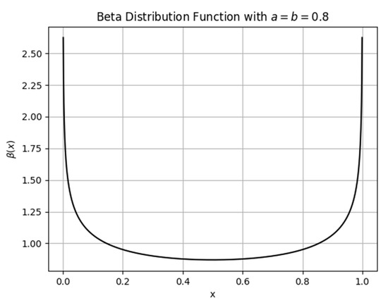 In this case, the shape of the density function is a symmetric U shape. As a result, the candidate solutions are most likely to be located near the boundaries of the search space, effectively ‘surrounding’ the global optimum within the initial particle population. Extensive experiments have shown that when , the initialization performs well. This parameter setting is also supported by several metaheuristic studies. Li et al. (2020) [36] and Agushaka and Ezugwu (2022) [37] found that symmetric beta initializations with parameters within the range of 0.5 to 3 significantly improve population diversity and convergence behavior in PSO, DE, and other optimizers. Specifically, a = b = 0.8 was used and recommended in Jian et al. (2017) [38] as an effective default in swarm-based algorithms. Although no further parameter tuning is performed in this study, the chosen value is already widely adopted and empirically validated, thus offering a robust and literature-supported trade-off without the need for exhaustive sensitivity testing. The probability density function of this distribution over the interval (0, 1) is shown in Figure 2. Based on the probability distribution, initial values for each dimension of are assigned according to the following formula: