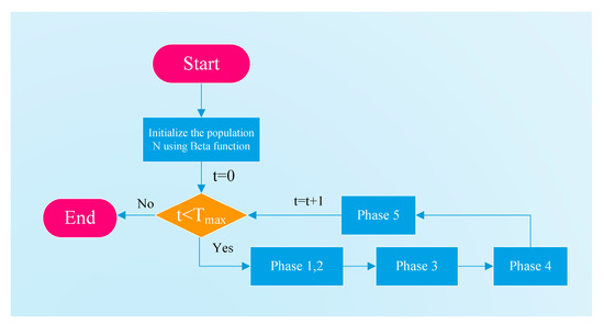 - The population is initialized using a beta function distribution, which enhances the diversity and uniformity of the population. This initialization method effectively avoids the issue of population concentration that may arise from traditional random initialization, providing a broader exploration of the solution space and improving the coverage of the initial search.