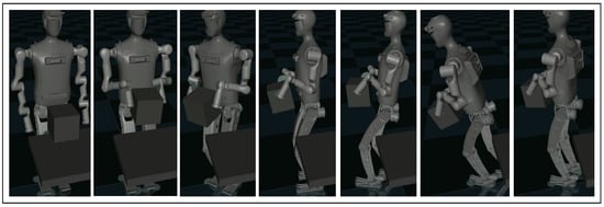 - Bouyarmane, K.; Kheddar, A. Using a multi-objective controller to synthesize simulated humanoid robot motion with changing contact configurations. In Proceedings of the 2011 IEEE/RSJ International Conference on Intelligent Robots and Systems, San Francisco, CA, USA, 25–30 September 2011; IEEE: Piscataway, NJ, USA, 2011; pp. 4414–4419. [Google Scholar]