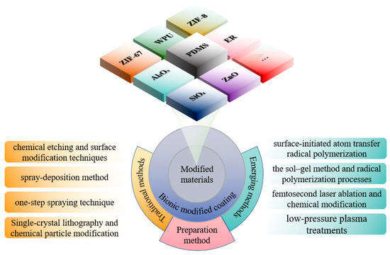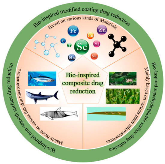 On the basis of exploring bio-inspired non-smooth surfaces and bio-inspired superhydrophobic surfaces, remarkable progress has been made in integrating these two types of surfaces into composite superhydrophobic grooved surfaces, resulting in a promising approach for the development of bio-inspired superhydrophobic surfaces. The synergistic advantages of these two structures can be fully utilized. However, despite the significant potential of bio-inspired superhydrophobic surfaces in the field of drag reduction, challenges remain in terms of the stability and durability of the gas layer, especially in complex fluid environments. Through continuous research on the characteristics of non-smooth and superhydrophobic surfaces and to further enhance the drag reduction performance and realize the multi-functional synergistic effect, researchers have begun to explore the emerging biomimetic modified coating technology based on the design of micro- and nanostructures and chemical modification of the materials, as shown in Figure 10. The development of modified coated surfaces is one of the current research hotspots in the field of materials science and engineering; it focuses on optimization of the physical, chemical, and mechanical properties of coatings through the introduction of specific modified materials [76,77,78]. In recent years, researchers have extensively explored the use of various materials in coatings, including polymers, nanoparticles, metal oxides, and composites. The choice and combination of these materials not only determine the surface properties of the coating, but also directly affect its application in the fields of drag reduction, antifouling, and anticorrosion [79,80,81,82].
