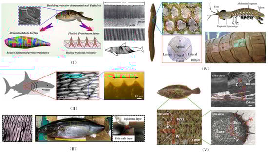 Surface microstructural features of mainstream bio-inspired objects: (I) streamline d body surface of pufferfish and morphology of dolphin skin [1,2]. (II) Shark scale structure and SEM images of shark skin [23]. (III) Multi-layered structure of tuna skin and its morphological features [26]. (IV) Surface microstructural morphology of mudskipper and dorsal and lateral views of the abdominal segments of mantis shrimp [30,34]. (V) Flounder skin scales and structural characteristics of individual scales [4].