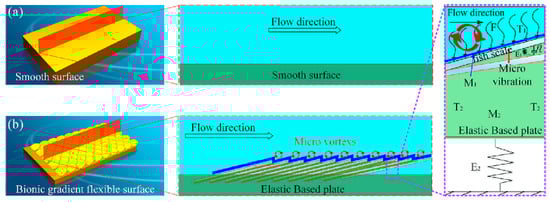 The schematic diagram of the drag reduction mechanism. (a) Smooth surface; (b) bio-inspired gradient flexible non-smooth surface [12].