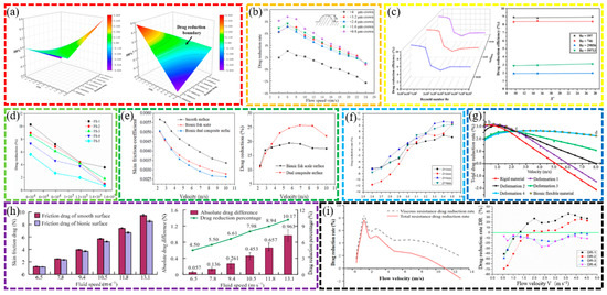 Effect of various factors on the rate of drag reduction [1,3,10,11,17,21,26,28,30,31]. (a) Spatial curve diagram of FPr, pressure drag and drag reduction rate. (b) Relationship between the water flow velocity and the drag reduction rate of the groove surface of the positive crown with different heights. (c) Drag reduction report according to the inflow velocity and dimensionless spacing. (d) Total drag reduction rate for biomimetic fish scale at different Re numbers. (e) Skin friction coefficient and drag reduction rate. (f) Curves of drag reduction rate for different jet diameters on bio-inspired surface. (g) Total drag reduction rate under different deformations. (h) The drag reduction efficiency of bio-inspired surface in variation with flow speed. (i) The relationship between drag reduction rate and flow velocity.