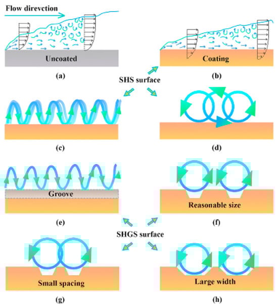In the public’s commonly held perception, the smoothness of the surface of an object and the magnitude of its frictional resistance are negatively correlated; that is, the smoother the surface, the lower its frictional resistance. However, the U.S. National Aeronautics and Space Administration (NASA), under the Langley Research Center, conducted related research that completely overturned this traditional concept. The results of this study clearly showed that surfaces with non-smooth groove structures can effectively reduce the frictional resistance of the wall [8,9]. For example, a three-dimensional staggered groove microstructure with a 90° orientation reduced the drag force by 11% compared with a smooth surface [10].