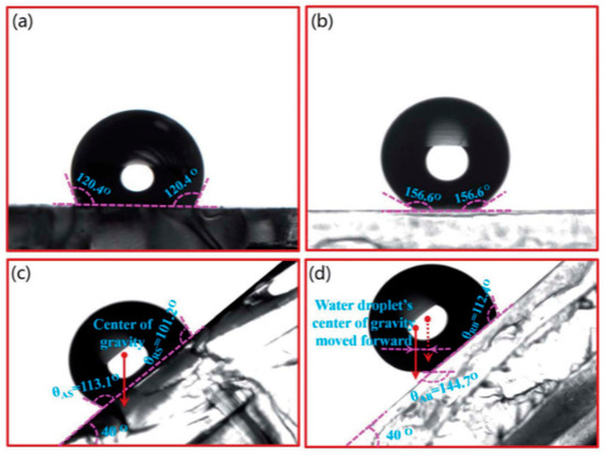 The wettability of smooth surface and bio-inspired superhydrophobic surface. (a) Static contact angle of smooth surface. (b) Static contact angle of bio-inspired superhydrophobic surface. (c) Rolling state of droplet on a smooth surface. (d) Rolling state of droplet on the bio-inspired superhydrophobic surface [56].