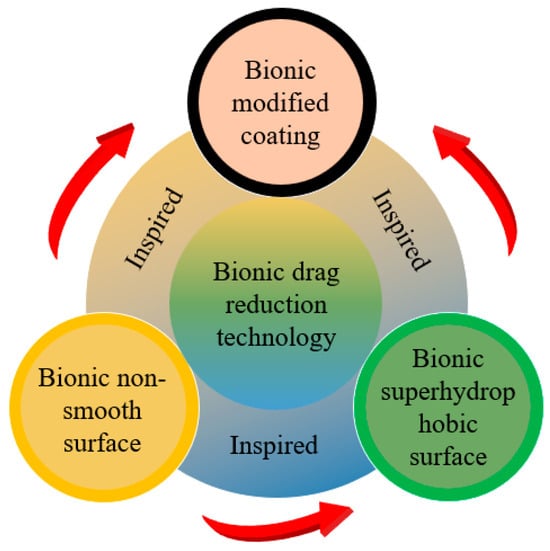 Herein, we systematically analyze the latest progress in bio-inspired drag reduction technology, focusing on analyzing the surface morphology parameters and exploring synergistic mechanisms under the multi-scale coupling effect. Comparing the applicable scenarios and technical bottlenecks of different methods provides a theoretical basis and technical reference for the energy-saving design of ships and underwater vehicles. The subsequent second to fourth sections of the article explore the three major technological paths in depth in sequence; in each section, the technological path and the corresponding bio-inspired objects are briefly introduced, the mainstream fabrication methods are summarized, the drag reduction effects and mechanisms are discussed, and, finally, the prospective engineering applications of the bio-inspired drag reduction technology are outlined.
