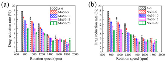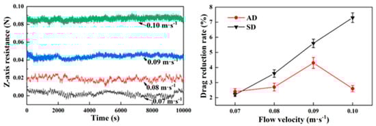 Modified coatings with superhydrophobicity prepared on non-smooth surfaces show significant potential for applications in drag reduction due to their unique surface grooves and wettability. It has been shown that by building micro- and nanostructures and reducing surface energy, such modified coatings can form a stable gas layer at the solid–liquid interface, effectively reducing fluid drag. Modified coatings based on polydimethylsiloxane (PDMS) and hydrophobic silica nanoparticles maintained a stable Cassie–Baxter state at a depth of 5 m underwater, with a maximum drag reduction of 25% and a slip length of approximately 70 µm [89]. The alumina-reinforced PDMS coating showed good drag reduction performance under low-Reynolds-number flow conditions, and the drag reduction rate was inversely proportional to the elastic modulus of the coating, suggesting that the mechanical properties of the coating have an important influence on the drag reduction effect. The drag reduction effects of micro-alumina- and nano-alumina-modified coatings are shown in Figure 12 [101]. The study’s results demonstrated that the bio-inspired modified coatings can significantly reduce the wall shear stresses and reduce the energy required to push the fluid or move the fluid through the channel by changing the chemical composition and topology of the surface.