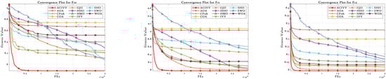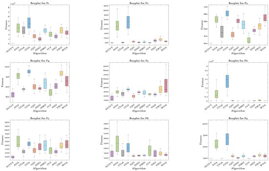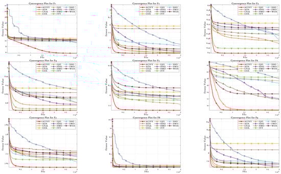 Figure 2, ACIVY can be characterized by fast initial convergence and subsequent stable refinement stages and is fastest in terms of fitness values in all categories of functions. The convergence curve of the algorithm can be described as having very sharp initial drop-off curves followed by very rapid stabilization at optimal or near-optimal solutions, which implies the existence of effective exploration-to-exploitation transition mechanisms within the improved ivy-inspired strategies. In the case of unimodal and simple multimodal functions (F1–F4), ACIVY shows a remarkable convergence rate and achieves optimal solutions in the initial 5000–10,000 FEs. The convergence curves depict dramatic fitness gains during the initial iterations, where F1 and F3 converged to the theoretical optimum with little variance. Conversely, the competing algorithms either converge at non-optimal solutions or have slower rates of convergence with better final fitness values. It is noteworthy that the original IVY algorithm demonstrates decent convergence behaviors but cannot compete with ACIVY in terms of accuracy and speed, which proves the efficiency of the suggested improvements.