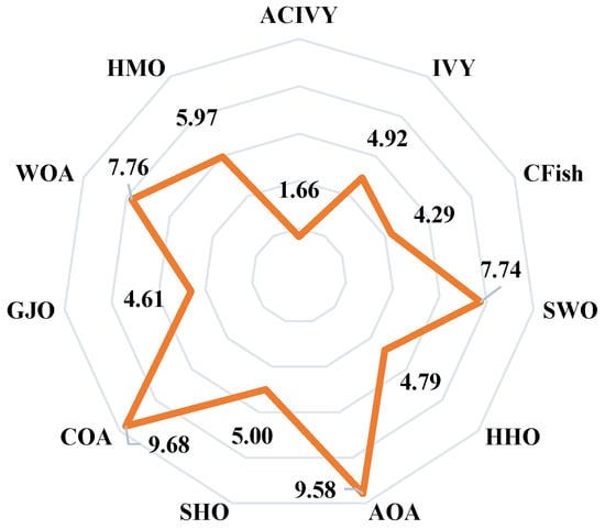 Figure 4 shows the results of the Friedman test, which gives a full ranking analysis of each of the algorithms on the entire CEC2022 benchmark suite. ACIVY attains the best average rank of 1.66 and significantly outcompetes all the competing algorithms and statistically dominates them in varying optimization landscapes. The original IVY algorithm still achieves a respectable average rank of 4.92, confirming the validity of the underlying approach but pointing to the immense gains made by ACIVY’s enhancements. The ranking order shows the existence of specific performance levels, where CFish (4.29) and GJO (4.61) comprise the second performance level and HHO (4.79) and SHO (5.00) belong to the middle-level performances. HMO (5.97), SWO (7.74), and WOA (7.76) are placed in the bottom part of the ranking, and AOA (9.58) and COA (9.68) take the last places. Such statistical ranking proves the outstanding ability of consistency in the performance of ACIVY in all categories of functions, and this shows its great flexibility in facing different kinds of optimization problems.