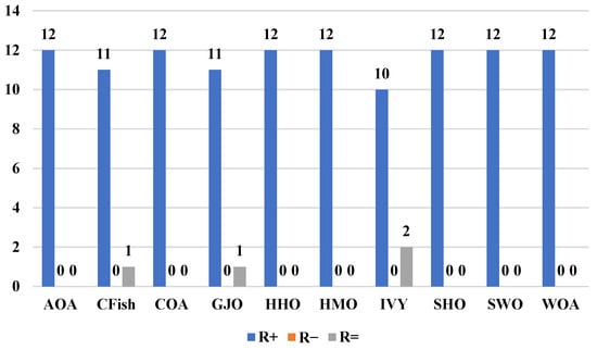 values are always zero in all of the pairwise comparisons. Compared to AOA, CFish, COA, GJO, HHO, HMO, SWO, and WOA, ACIVY has statistical dominance (shows a better performance on 12 functions and never performs worse on any of the 12 functions). ACIVY also performs better on 10 functions against IVY and SHO, with 2 ties (