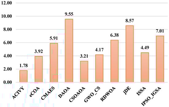 Figure 6 generates the statistical dominance of ACIVY with a mean rank of 1.78, which is significantly better than all the sophisticated competitors on the 50-dimensional optimization search space. CSOAOA proves to be the most competitive algorithm with a mean rank of 3.21, slightly followed by eCOA 3.92, meaning that these algorithms are moderately competitive, irrespective of the fact that their performances differ significantly. There are the middle-tier GWO_CS (4.17) and ISSA (4.49), and the weak overall performance of such algorithms as CMAES (5.91), RDWOA (6.38), and IPSO_IGSA (7.01). The low-ranking algorithms, jDE (8.57) and DAOA (9.55), exhibit notably bad adaptation to high-dimensional optimization problems, where DAOA is ranked among the last in the majority of the functions.