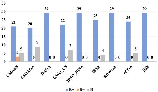 values indicate occasional statistical ties with CMAES (5), CSOAOA (9), GWO_CS (7), RDWOA (4), and jDE (5), but these represent performance equivalence rather than losses. The absence of